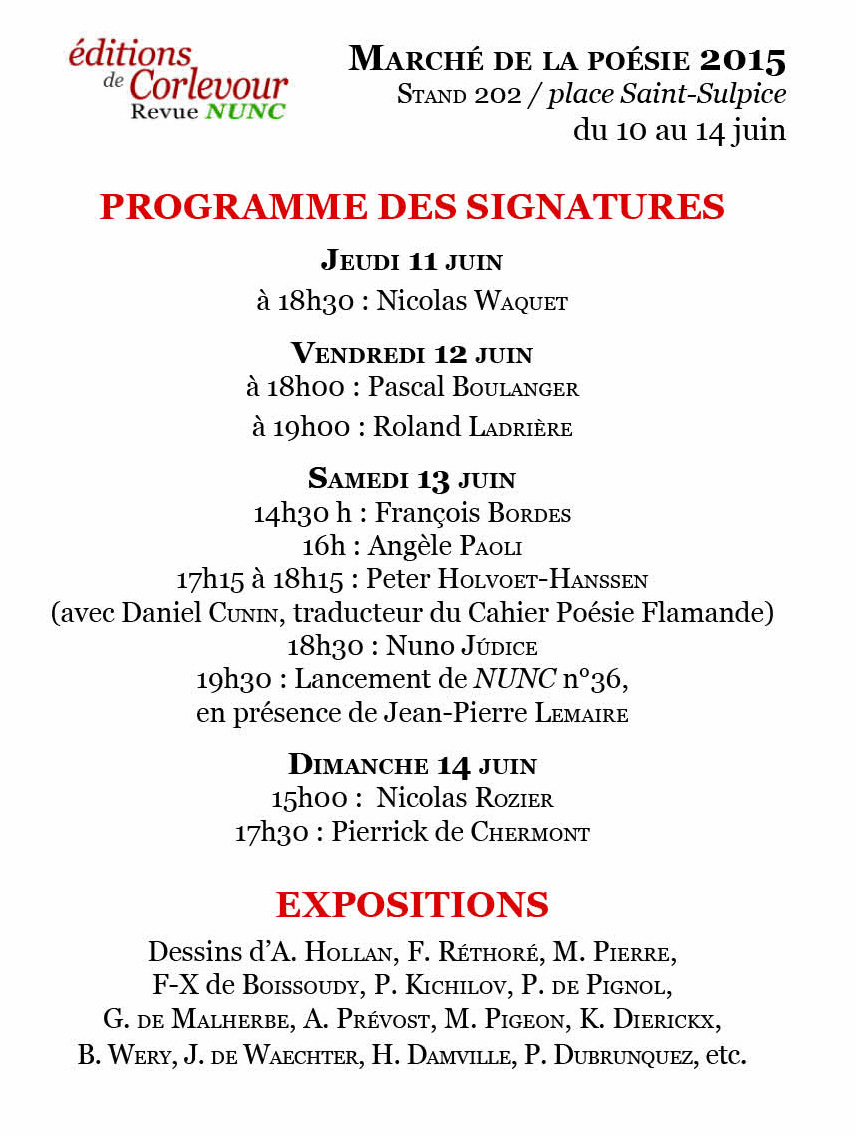 Programme des signatures des éditons de Corlevour et de la revue NUNC.