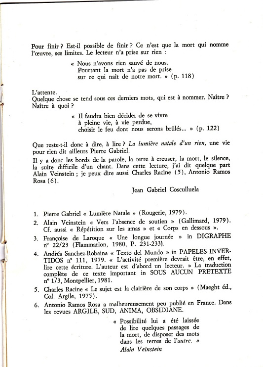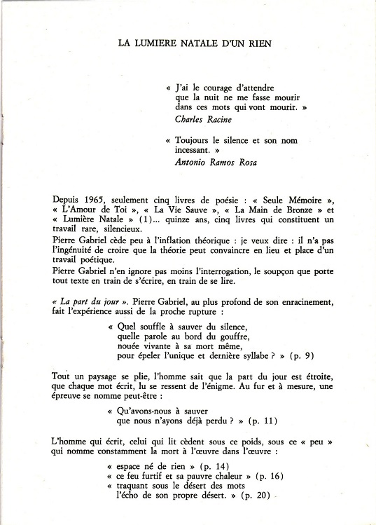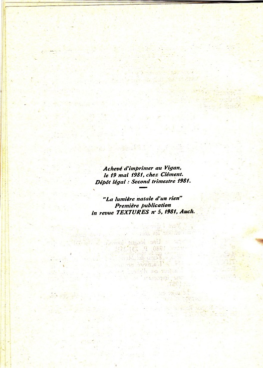 La lumière natale d’un rien Par | 29 juin 2014|Catégories : Blog| L’auteur de l’article Tous ses articles[print-me] En partage FacebookXLinkedInTumblrPinterestEmail Articles similaires Chronique musicale (17) : WATT de Bertrand Belin Galerie Chronique musicale (17) : WATT de Bertrand Belin Modern Poetry in Translation : Un pont entre les langues et les cultures Galerie Modern Poetry in Translation : Un pont entre les langues et les cultures Autour des éditions Aux cailloux des Chemins : Matthieu Lorin, Dominique Boudou et Thierry Roquet. Galerie Autour des éditions Aux cailloux des Chemins : Matthieu Lorin, Dominique Boudou et Thierry Roquet. ANIMAL — POÉSIE D’AUJOURD’HUI | HIVER 2023 Galerie ANIMAL — POÉSIE D’AUJOURD’HUI | HIVER 2023 Valéry Zabdyr, Injures précédant un amour légendaire Galerie Valéry Zabdyr, Injures précédant un amour légendaire Une maison pour la Poésie 2 : La Maison de Poésie Transjurassienne : entretien avec Marion Cirefice Galerie Une maison pour la Poésie 2 : La Maison de Poésie Transjurassienne : entretien avec Marion Cirefice 12 POÈMES DE JEAN ROUSSELOT choisis par Christophe Dauphin Galerie 12 POÈMES DE JEAN ROUSSELOT choisis par Christophe Dauphin Evelyne Deferr, Soudain sans retour Galerie Evelyne Deferr, Soudain sans retour LA MÈRE MICHEL A LU Galerie LA MÈRE MICHEL A LU Écrits spirituels du Moyen-âge, traduits et présentés par Cédric Giraud, Walter Benjamin, Asja Lācis, Alfred Sohn-Rethel, Sur Naples, Jean-Pierre Vidal, Exercice de l’adieu Galerie Écrits spirituels du Moyen-âge, traduits et présentés par Cédric Giraud, Walter Benjamin, Asja Lācis, Alfred Sohn-Rethel, Sur Naples, Jean-Pierre Vidal, Exercice de l’adieu Russie. L’Immense et l’intime Galerie Russie. L’Immense et l’intime Miguel de Cervantes et Tirso de Molina, Maris dupés Galerie Miguel de Cervantes et Tirso de Molina, Maris dupés Le féminin pluriel de l’Atelier de l’Agneau Galerie Le féminin pluriel de l’Atelier de l’Agneau Bernard Grasset, Brise Galerie Bernard Grasset, Brise MARIO MARTÍN GIJÓN, Poésie/prisme et passion de traduire suivi de Poèmes de Des en canto, Galerie MARIO MARTÍN GIJÓN, Poésie/prisme et passion de traduire suivi de Poèmes de Des en canto,