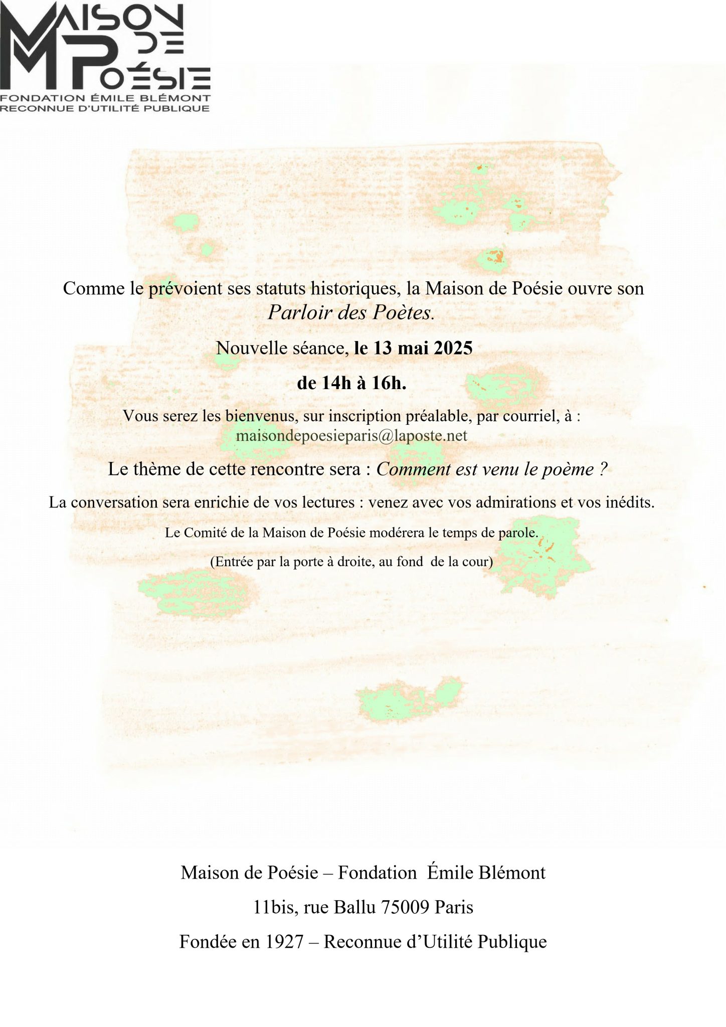 La Maison de Poésie – Fondation Émile Blémont est une fondation reconnue d’utilité publique au service des poètes et de la poésie, administrée exclusivement par des poètes selon la volonté de son fondateur Emile Blémont, poète lui-même, ami de Verlaine et de Rimbaud. La définir ainsi, c’est aussi laisser entendre sa mission, son fonctionnement et son originalité. Sa mission est de servir la poésie. Elle n’est pas la seule à se donner cet objectif à Paris, mais elle se distingue par la rencontre de trois points essentiels : son statut unique de fondation d’utilité publique, un lieu qui permet la rencontre, la gestion statutaire exclusivement par des poètes. Cette conjonction lui permet de se développer dans différentes directions, des échanges entre poètes à la rencontre des poètes avec des amateurs de poésie, aussi bien que l’édition d’anthologies.